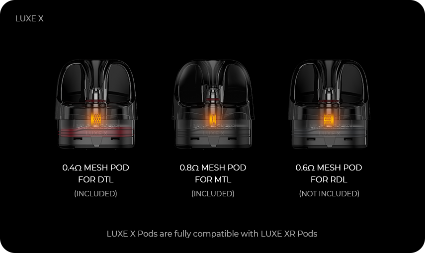 The GTX 0.4Ω MESH coil and GTX 0.8Ω MESH coil with customized pods for both MTL and RDL experience. It's also compatible with GTX Coil platform.The LUXE XR pods are fully compatible on the LUXE X.